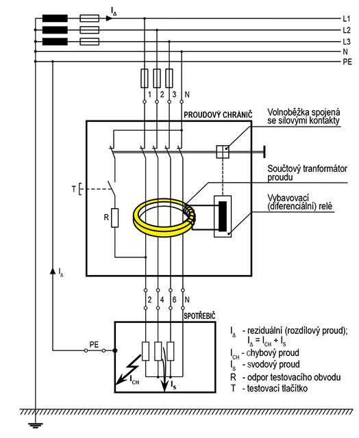 V případě kdy součet vstupního a výstupního proudu není stejný, proudový chránič vybaví.